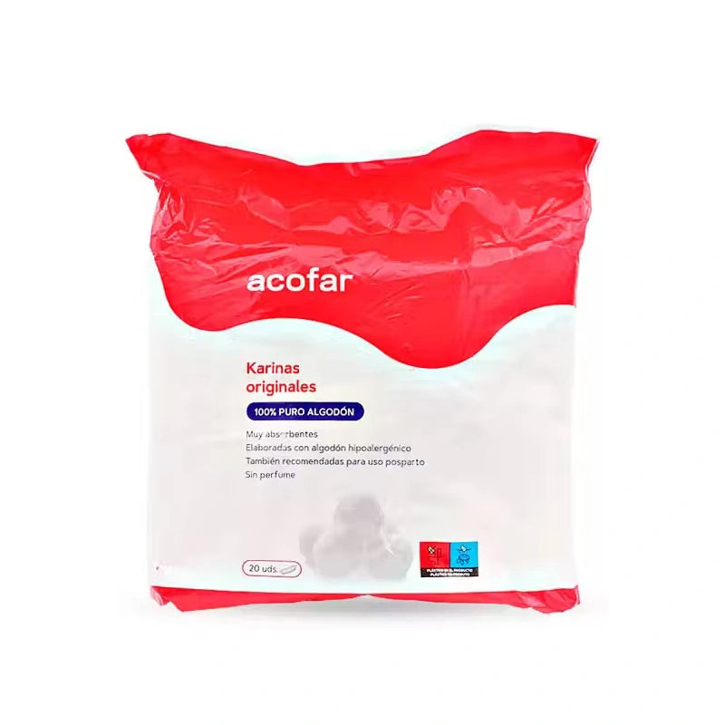 Algodón 100%, núcleo absorbente y adhesivo hipoalergénico.