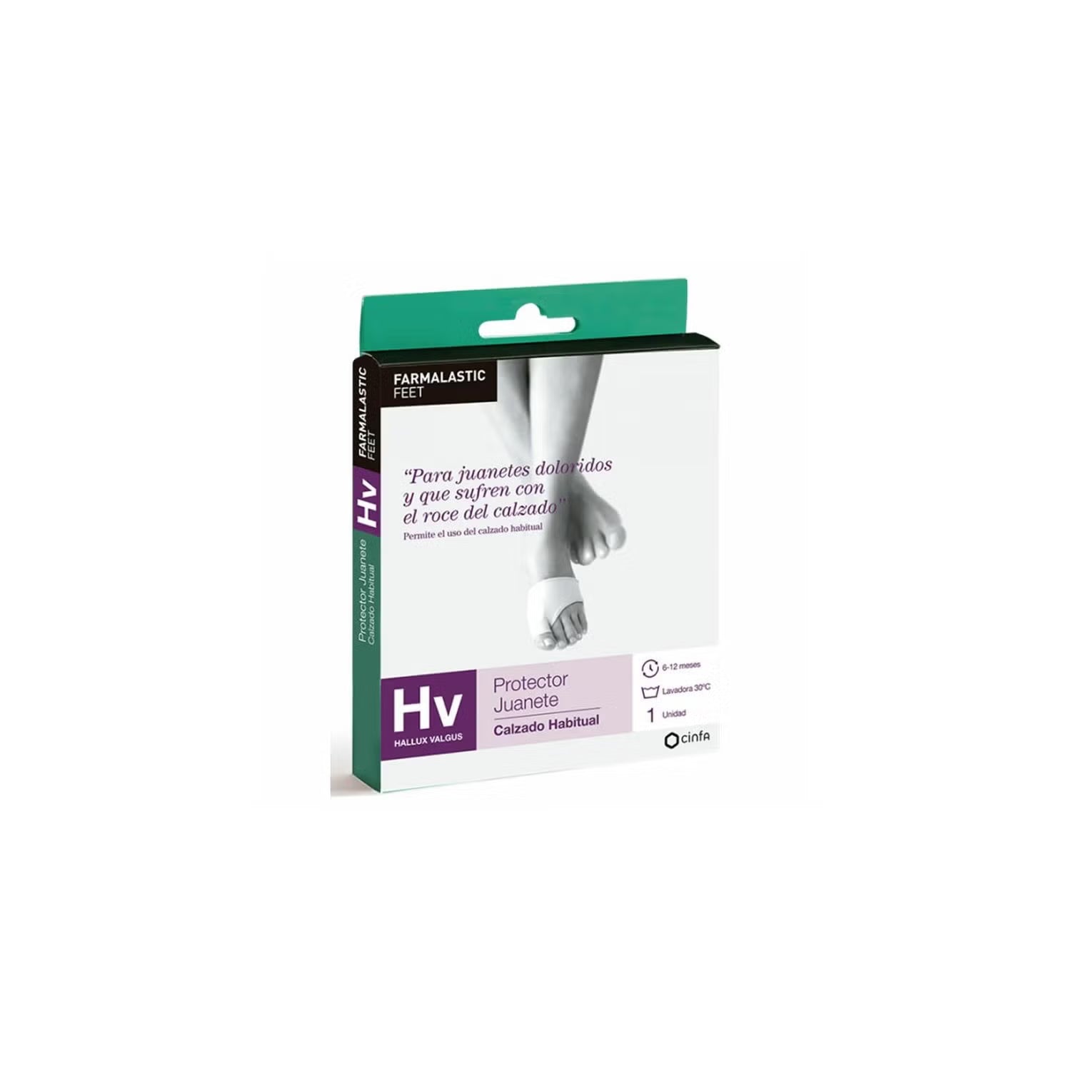 Es un protector de juanetes de la marca Farmalastic diseñado para aliviar molestias y reducir la fricción en la zona del juanete (hallux valgus). Está fabricado con gel de silicona cubierto con un tejido suave y flexible, y viene en talla grande, apta para pies más grandes (por lo general talla de calzado aprox. 42‑45).