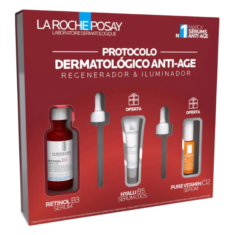 El Cofre Retinol B3 de La Roche‑Posay es un pack antiedad dermatológico centrado en el sérum Retinol B3, junto con productos adicionales de regalo (según la versión del cofre, puede incluir un sérum de ácido hialurónico para ojos y/o un sérum de vitamina C). Está diseñado para ofrecer una rutina completa de cuidado facial que va más allá de un solo producto, combinando tratamiento antiarrugas y apoyo hidratante o iluminador.