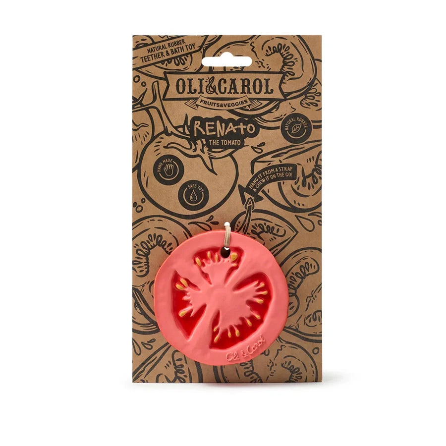 Un mordedor de silicona en forma de tomate, ideal para los bebés que sufren de dolor durante la dentición.